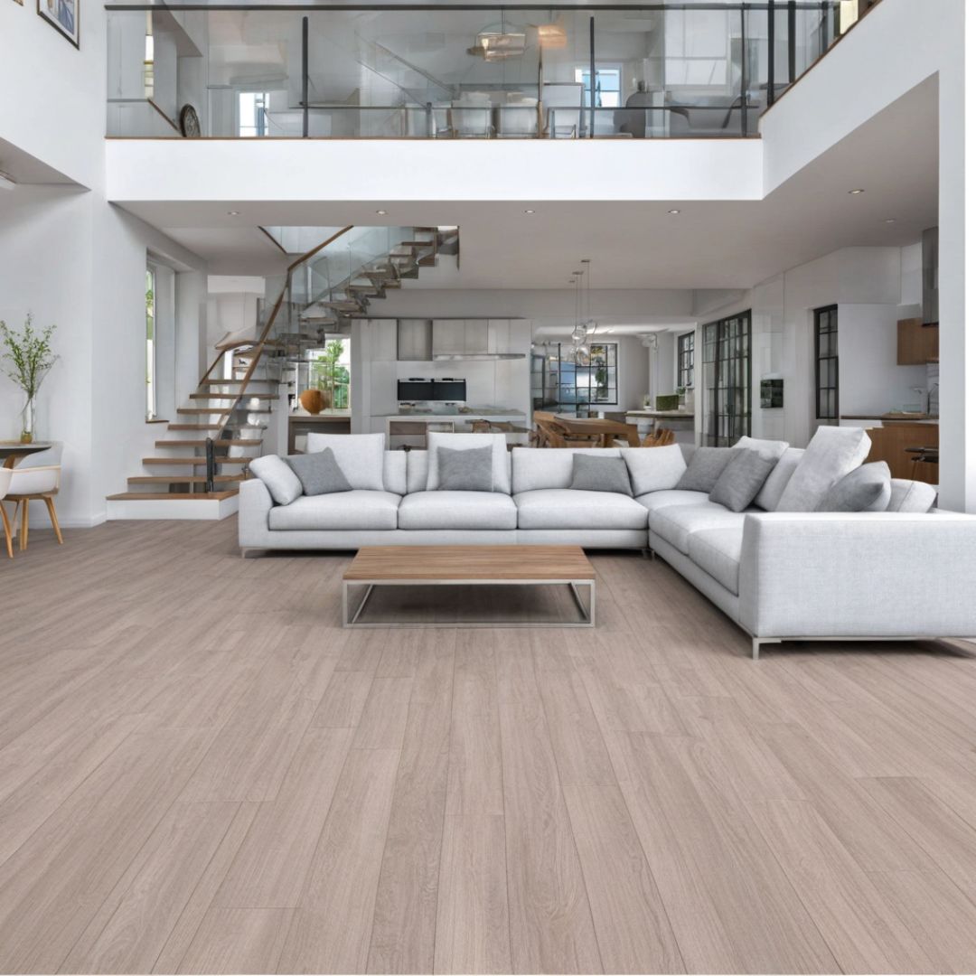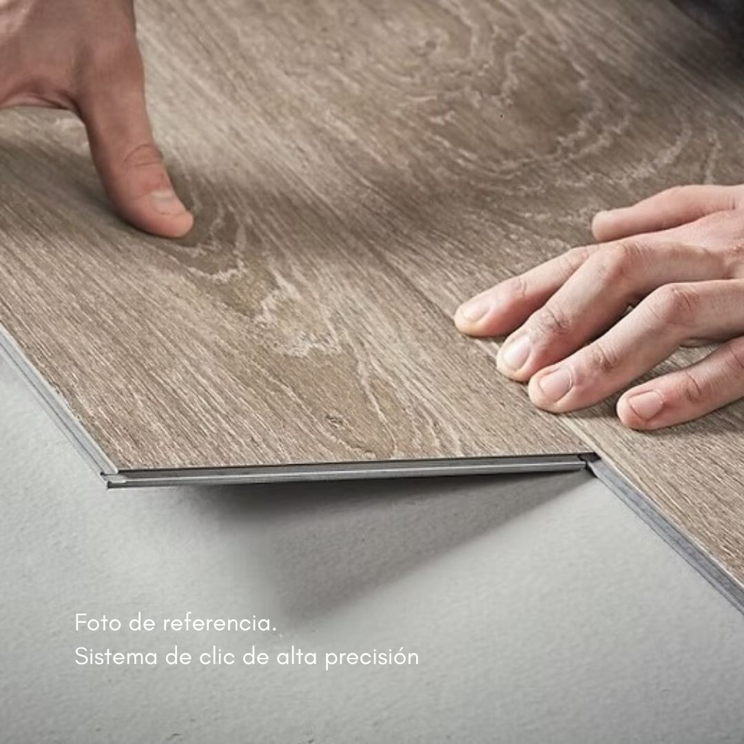Material: Núcleo rígido SPC (Stone Plastic Composite) que imita la apariencia de la madera natural con mayor resistencia.