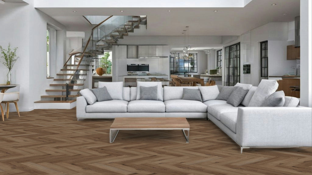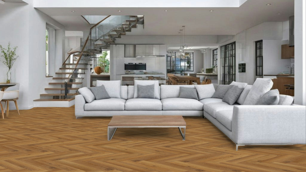 El patrón de instalación en espiga (Herringbone) ofrece un toque clásico y atemporal que añade dinamismo y carácter a cualquier espacio, convirtiendo el piso en un elemento decorativo por sí mismo.
